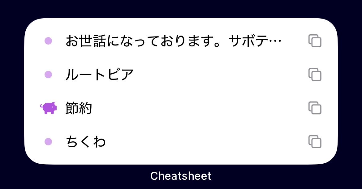 アクションウィジェットはメモに対して、タップしたらそのメモをコピーするとかリンクを開くとかができるやつ。 ☝️これはタップしたらコピーできるように設定したアクションウィジェット。定型文とか、よく使う文章やタグをコピペして使うのに便利じゃないかな。