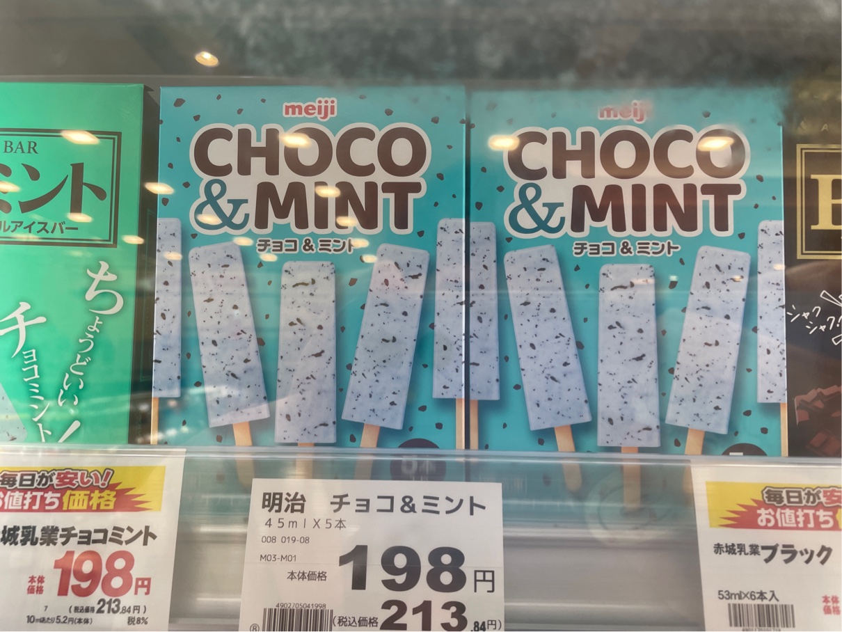 チョコミントアイスの箱は横に並べた時に柄が揃うようになっている。気持ちいい。